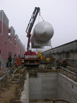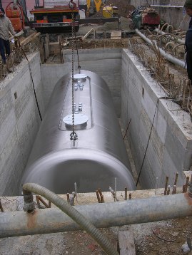 Serbatoio diviso in due sezioni da 10.000 lt. ciascuna. Travaso mediante pompe a membrana pneumatiche con supervisione e controllo.